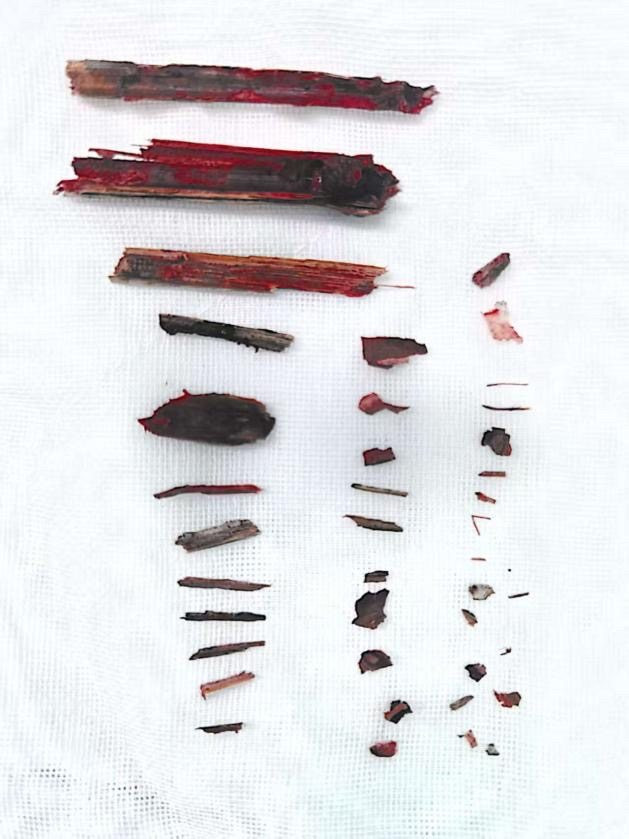 手术中医生发现,刘先生鼻腔内共插入竹片约40块,粗细不一,最粗直径近10毫米,最细则如牙签。竹片刺入方向各异,部分垂直向上,部分斜向穿插,解剖关系复杂。
